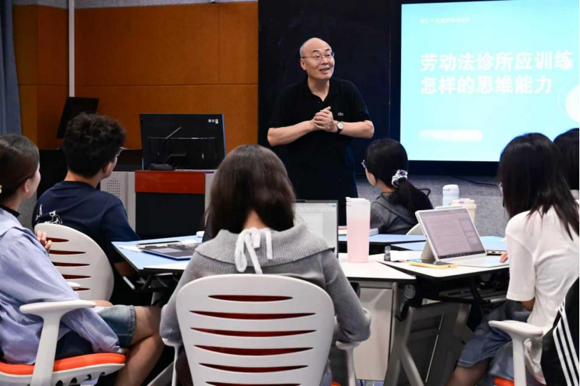 然后,谢老师从六个方面就劳动法诊所应训练的思维能力展开了系统阐述。一是案件类型的全面把握,包括劳动争议案件、劳动行政案件、公益行政案件以及特殊民事侵权,尤其是雇员个人信息侵权救济。他指出职业分类与个人信息保护的关联度越来越高,就业歧视案件中的疑难问题,如歧视性解雇的效力认定,仍是司法实践中的难点;二是是法律思维链条的构建能力,即从事实到法律事实,再到证据、法律关系和法律责任的逻辑推演,劳动法案件的个案性极强,必须精准界定法律关系与归责原则;三是法律解释能力,他通过实例说明社会对法律常有误解,司法解释的出台正是为了统一适用标准,因此要深入研读法条,准确理解“弱者”的法律定义,并掌握法律解释的方法;四是数据与案例分析能力,要熟练运用大数据收集案件资料,结合指导性案例与热点案例进行分析,这些工具已成为现代法律实务的重要支撑;五是跨领域法律思维,能够融通民法、行政法等相关法律,拓展代理思路,寻找最佳路径,因为很多情况下法律并无直接规定,需要创造性地寻找解决方案;六是非诉讼与法律顾问能力,包括非诉讼咨询、法律文件起草以及企业法律顾问实务,这些技能将为同学们未来的职业发展奠定坚实基础。