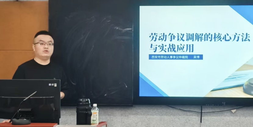 2025年10月29日晚,西安市人力资源和社会保障局公职律师、西安市劳动人事争议仲裁院仲裁员、西北政法大学经济法学院实务导师吴博为第35期劳动法诊所学员作了“劳动争议调解的核心方法与实战应用”专题讲座。讲座由劳动法诊所负责人高瑾老师主持。