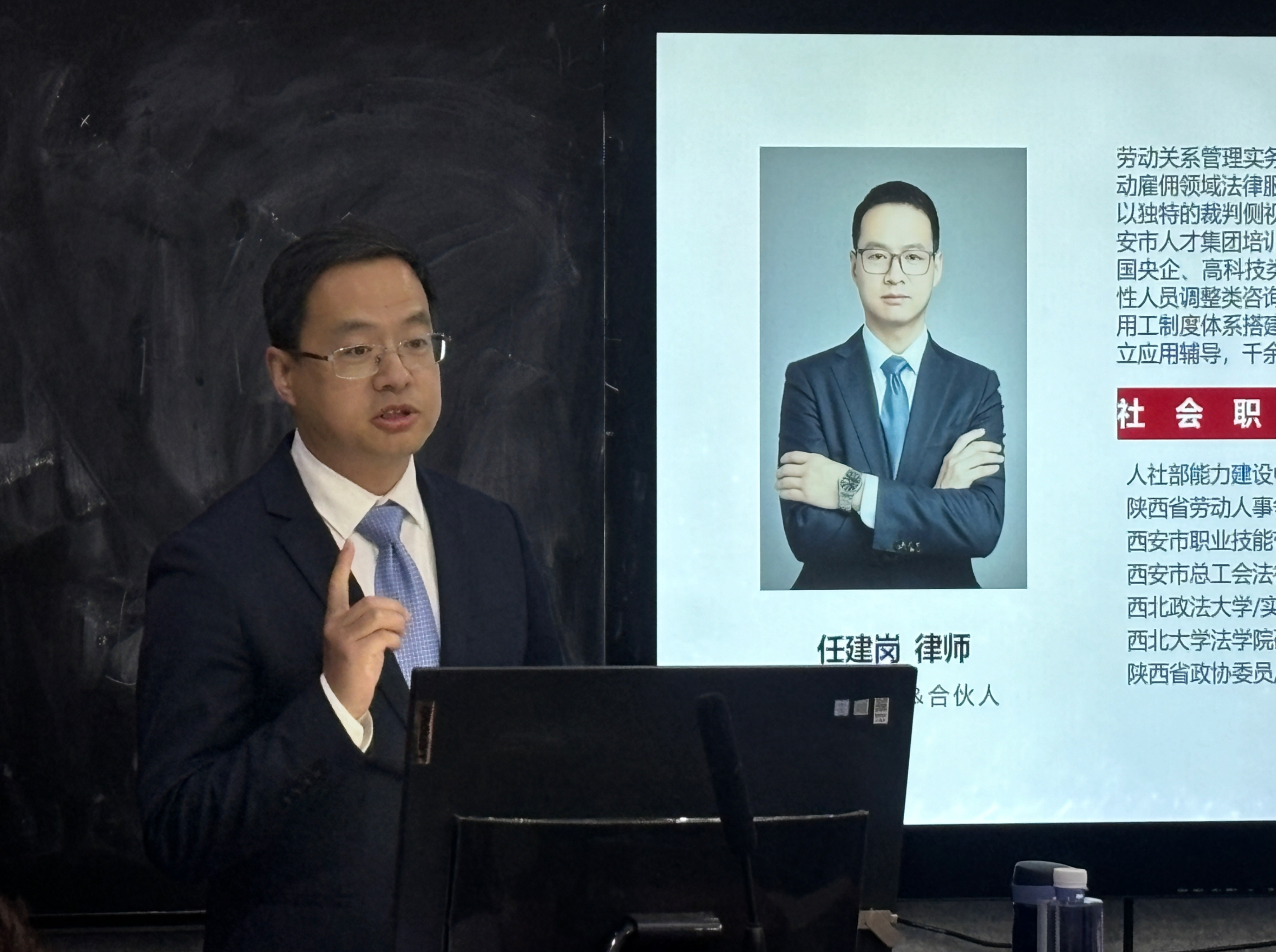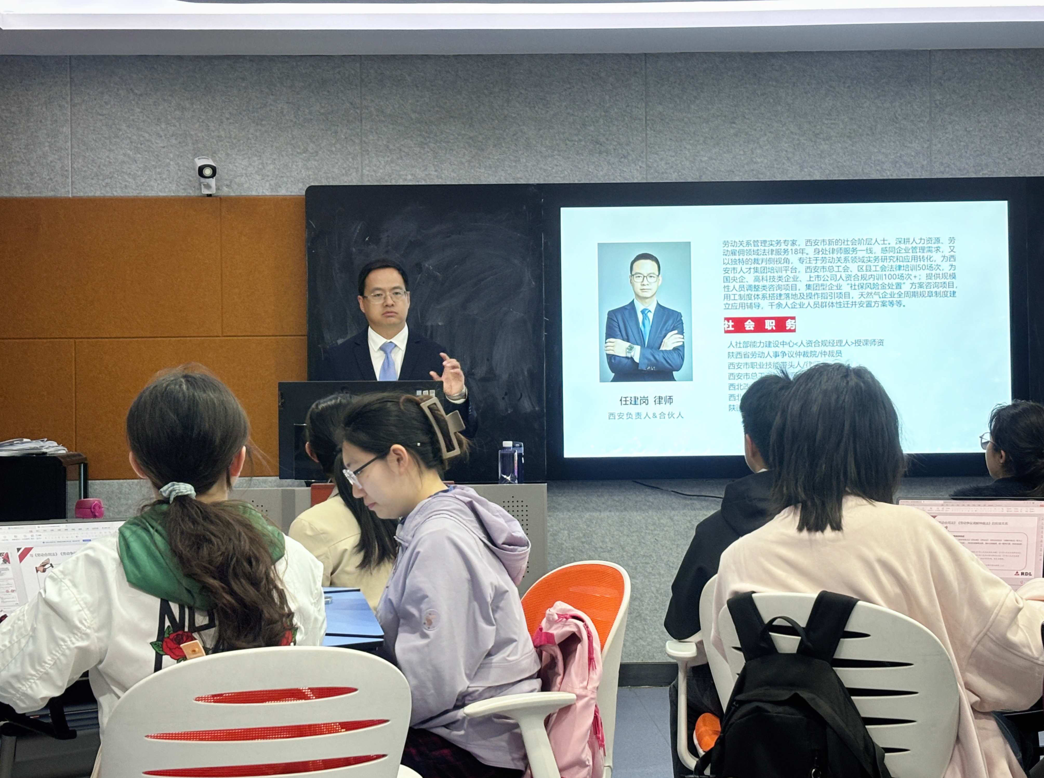 2026年4月8日晚,上海江三角(西安)律师事务所合伙人、陕西省劳动人事争议仲裁院仲裁员、我校实务导师、劳动法资深律师任建岗,为第36期劳动法诊所学员作《新规新政背景下劳动法十大实务问题应用探究》专题讲座。讲座由诊所负责人高瑾老师主持。
